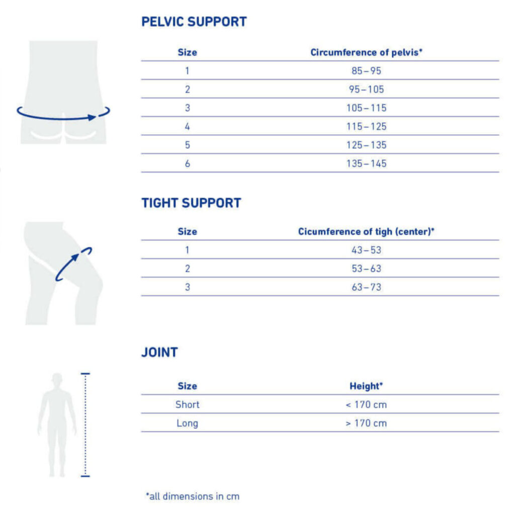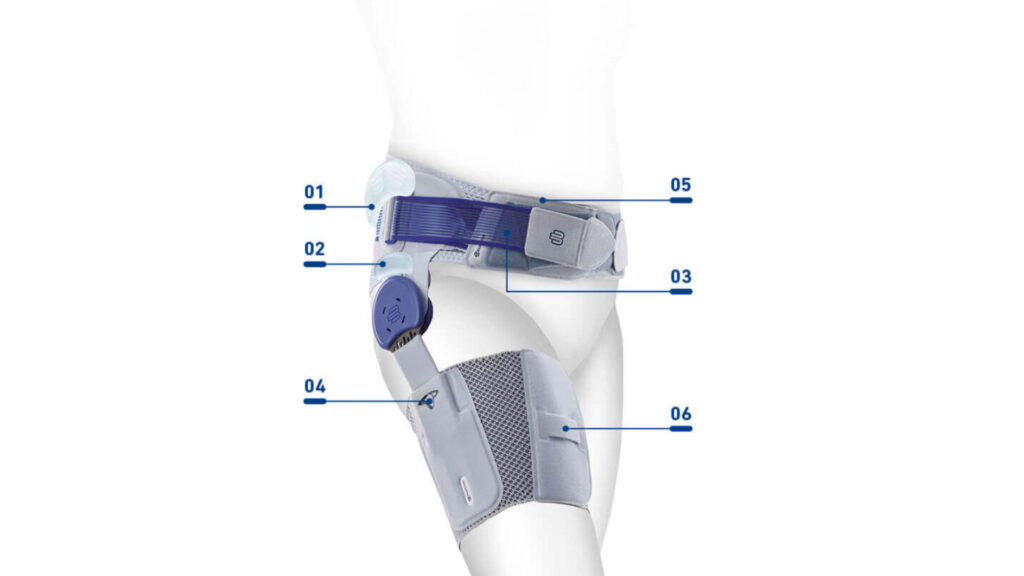 An adjustable support made of breathable, elastic material surrounds the pelvic ring, another one surrounds the thigh. Both are connected by a flat, bracing joint splint made of aluminum. This splint guides and supports leg movement while walking. If required, the range of motion can be limited toward the front and/or the back. Two special pressure cushions (pads) massage the transition from the lumbar spine to the pelvis. While walking, another cushion, called Trochanter Pad, moves up and down over the greater trochanter (the protrusion of the thigh bone). In this way, it acts on the tendon insertions and alleviates pain. Patients suffering from hip problems know a similar effect when they push down on the painful area with their fingers to feel relief. At the same time, sensorimotor function is activated. The Gluteal Pad massages trigger points on the upper side of the pelvis. All this has a relaxing effect on the hip muscles.
