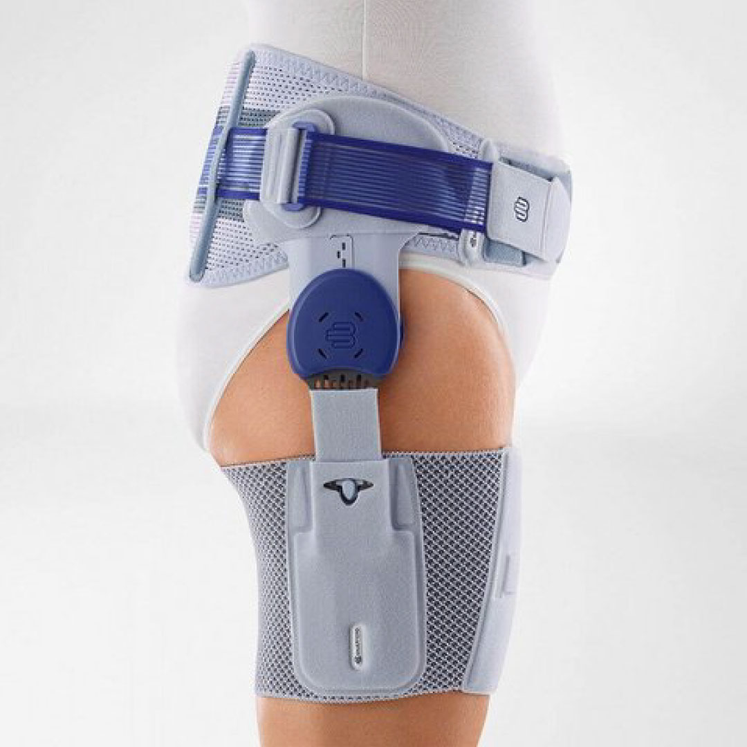 An adjustable support made of breathable, elastic material surrounds the pelvic ring, another one surrounds the thigh. Both are connected by a flat, bracing joint splint made of aluminum. This splint guides and supports leg movement while walking. If required, the range of motion can be limited toward the front and/or the back. Two special pressure cushions (pads) massage the transition from the lumbar spine to the pelvis. While walking, another cushion, called Trochanter Pad, moves up and down over the greater trochanter (the protrusion of the thigh bone). In this way, it acts on the tendon insertions and alleviates pain. Patients suffering from hip problems know a similar effect when they push down on the painful area with their fingers to feel relief. At the same time, sensorimotor function is activated. The Gluteal Pad massages trigger points on the upper side of the pelvis. All this has a relaxing effect on the hip muscles.