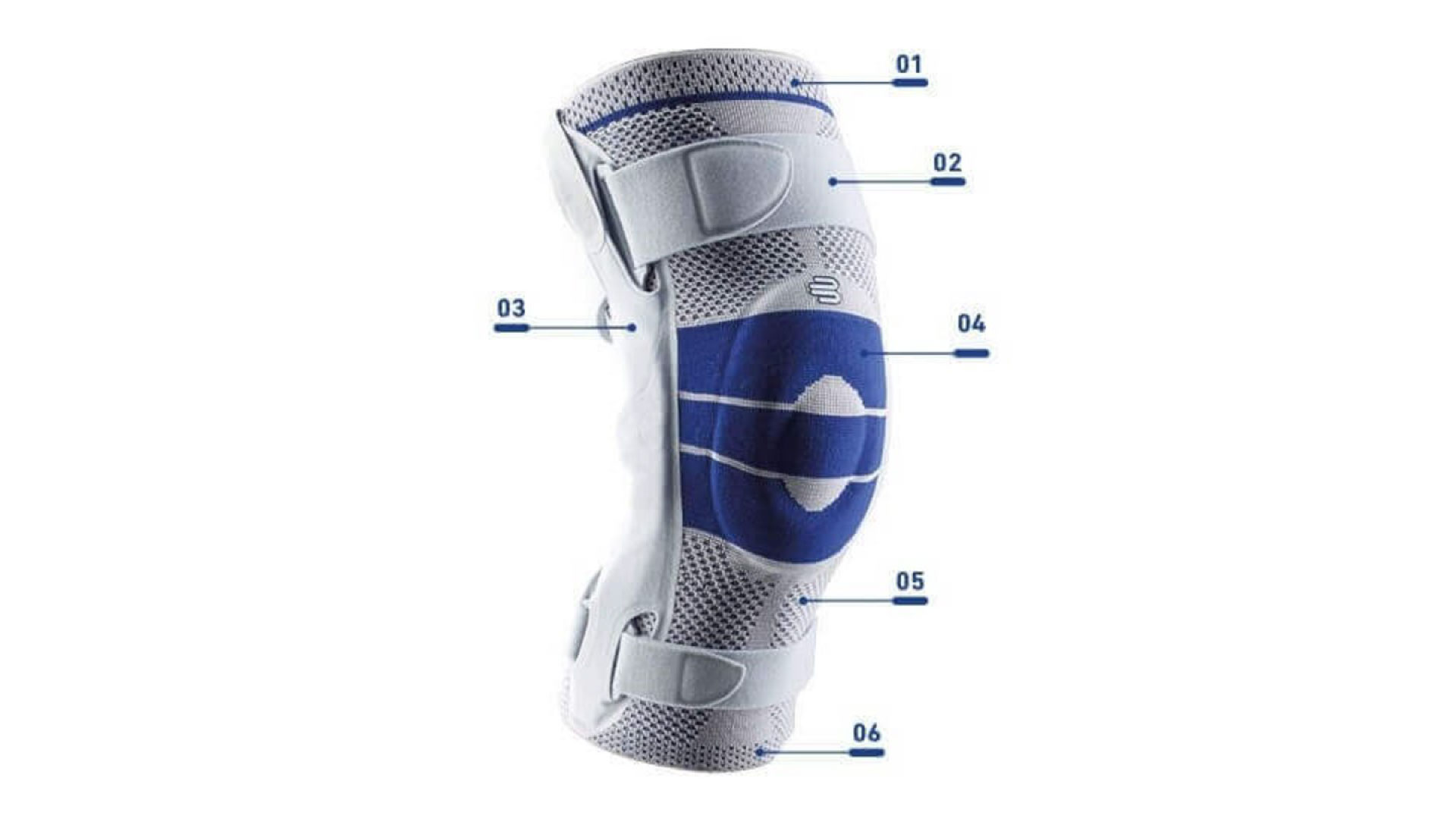 Lateral stays with hinges are the core functional element of the support. They offer passive stabilization as well as active muscular stabilization of the joint thanks to the knitted fabric. This makes it different from conventional knee supports or rigid elements.