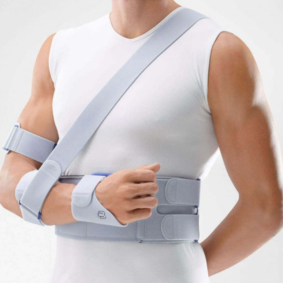 After surgery or an injury such as a dislocated shoulder, the first thing your joint requires is total rest. The OmoLoc orthosis immobilizes the shoulder by fixing the bent arm against the abdomen: three Velcro straps hold your arm firmly on an abdominal strap. They can be positioned freely to ensure a secure fit for any arm length.